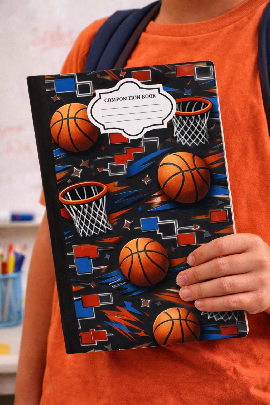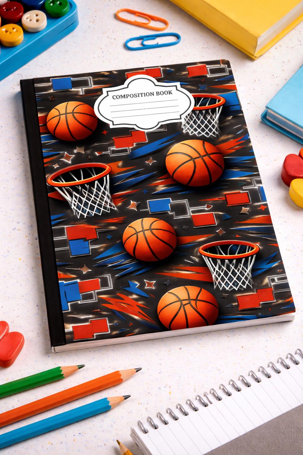 Bring some basketball energy to school and study time with this bold basketball-themed composition notebook. Perfect for students, athletes, and basketball fans who want a notebook that stands out.