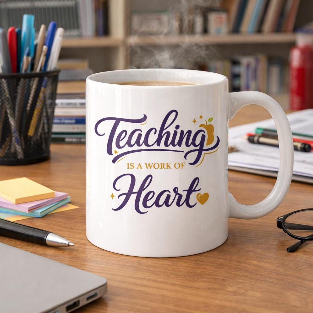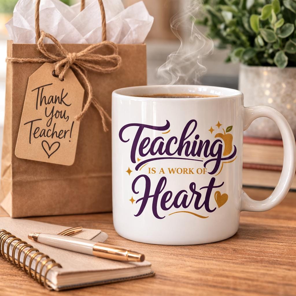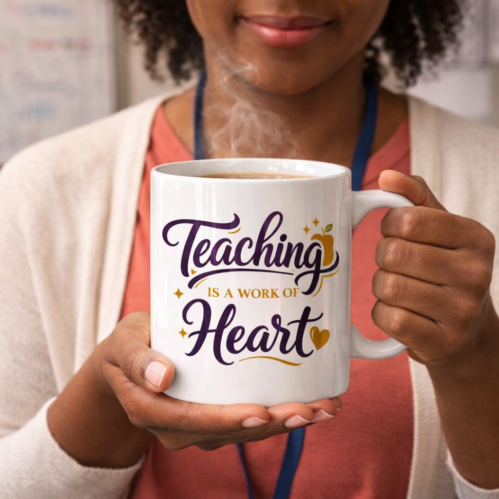 This warm, white ceramic mug reads like a small celebration for teachers — a steady companion during morning coffee, late-night lesson planning, and classroom celebrations. The delicate script and gold-accented details feel personal and thoughtful, an everyday reminder that teaching is an act of heart. It sits comfortably in hand, keeps drinks safe in the microwave, and cleans up quickly after a long week. Place it on a teacher’s desk, beside a stack of graded papers, or on a kitchen counter where daily routines begin.