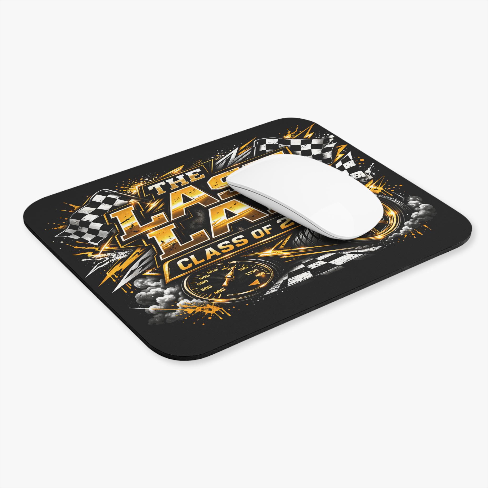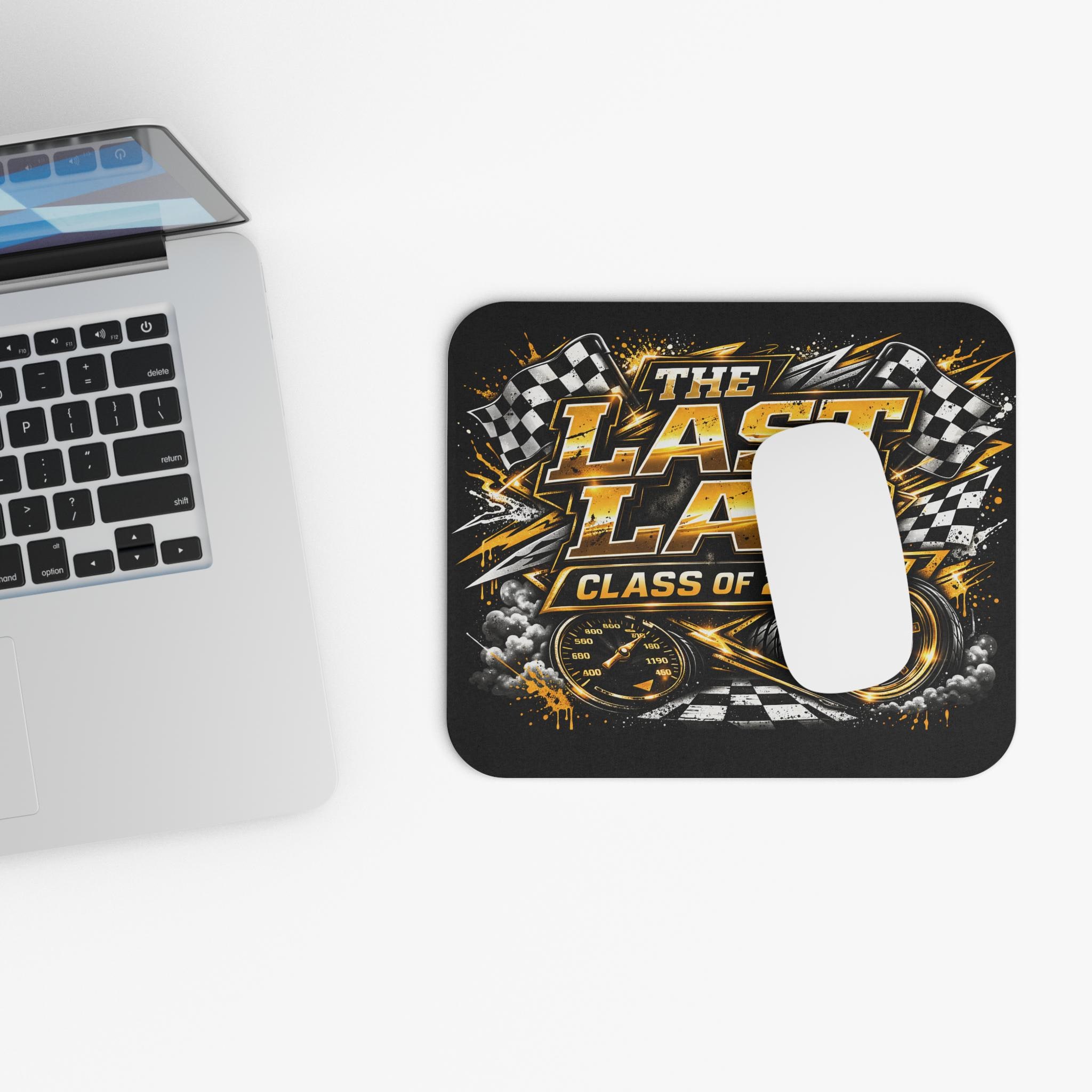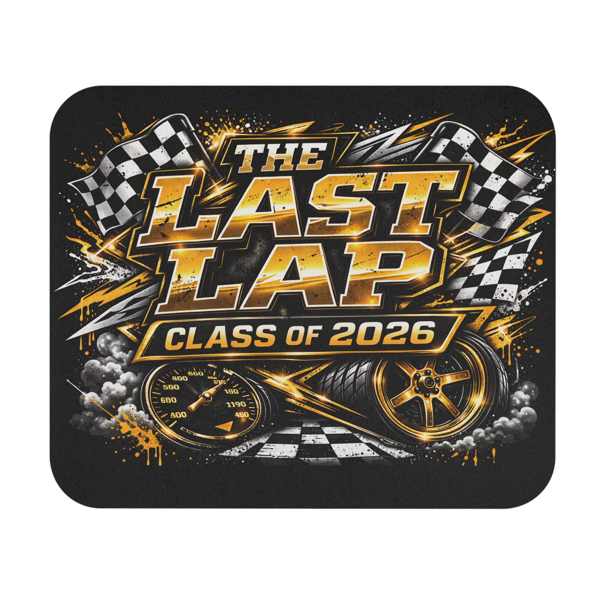 A bold, high-energy mouse pad that brings the thrill of the finish line to any desk. Dark, gritty blacks and metallic gold accents frame roaring checkered flags, speed dials, and racing tire art around the headline “The Last Lap — Class of 2026.” The smooth, vibrant-printed surface gives consistent tracking for optical and laser mice while the thin, dense foam and rubber base keep the pad steady during intense clicks and quick swipes. It sits low and unobtrusive on your workspace, slipping into study sessions, gaming marathons, or celebration setups for graduates who live fast and finish strong.