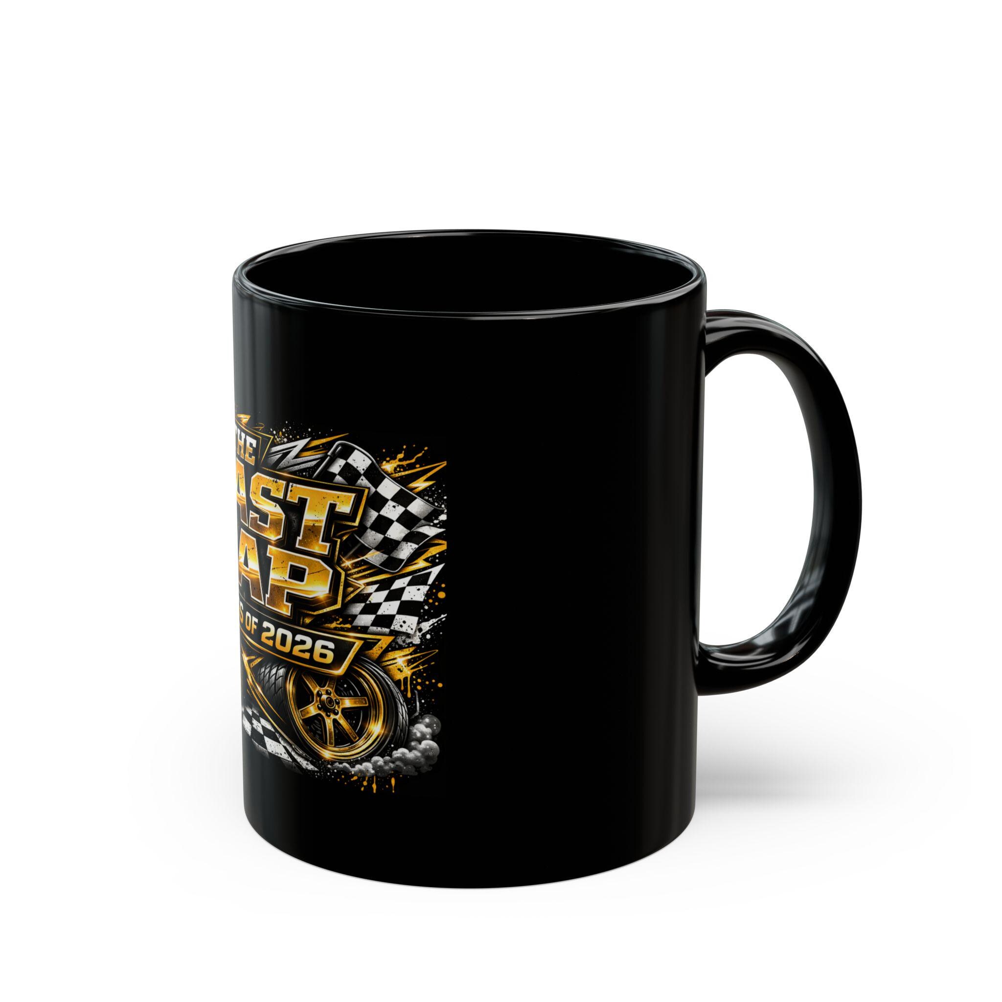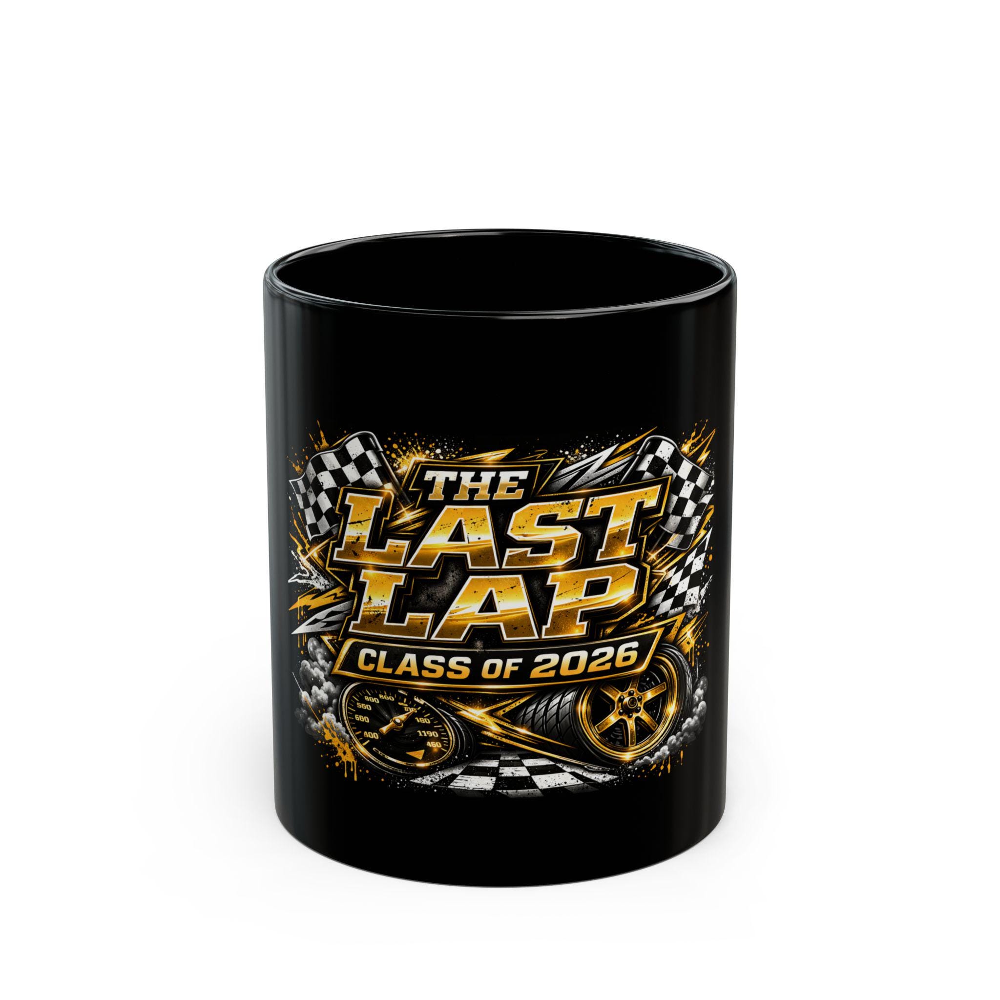 A glossy black ceramic mug that celebrates the finish line with attitude. Bold gold and checkered-flag graphics read “The Last Lap — Class of 2026,” surrounded by speed-inspired details like tire marks, a speedometer face, and racing stars. The vivid print pops against the deep black finish, making morning coffee feel like a victory lap. Comfortable C-shaped handle and two size options let you choose a generous pour for long study sessions or a standard cup for quick refuels. Durable and BPA-free, it stands up to daily use—heat it in the microwave and clean it in the dishwasher without worry. A spirited piece for grads who love speed and style, it brings a little racetrack energy to desks, dorm rooms, and celebration gatherings.